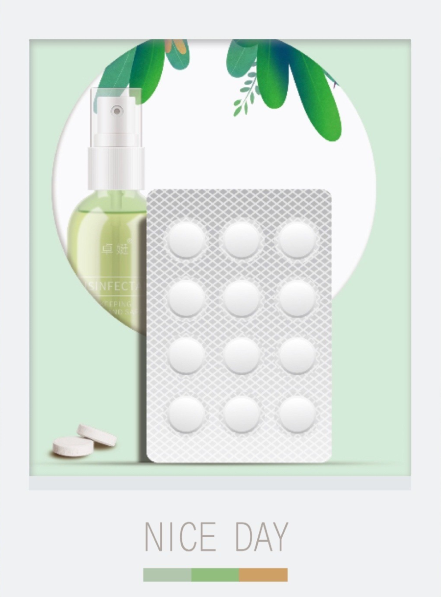 取本品1片溶解在50ml水里,喷洒物体表面或室内空气中消毒。